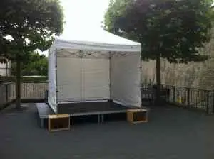 Wie bekommt man einen 3x3m Faltpavillon sicher auf so eine Bühne gestellt?